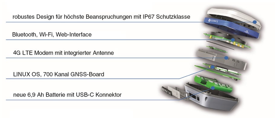 und umfasst viele Funktionen: Linux-Betriebssystem, Web--Interface, 4G-Modem, Atlas-Dienst mit aRTK, hohe Batteriekapazität und IP67-Zertifizierung.